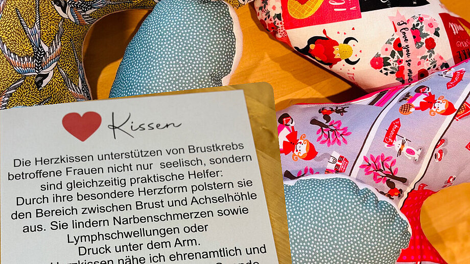 Die 45-jährige hat die Stoffe für die Herzen aus Spenden finanziert und ist dankbar, dass sich so viele Menschen daran beteiligt haben. Für das Frühjahr plant sie eine weitere Näh-Aktion. „Die Zugänge, die Krebspatientinnen und -patienten oft unter der Haut liegen haben, befinden sich meist an einer Stelle am Oberkörper, auf die ein Rucksack oder Autogurt drücken kann. Um dieses unangenehme Gefühl etwas abzuschwächen, eignen sich kleine Kissen sehr gut.“ In den kommenden Wochen sollen deshalb einige neue Portkissen für die Frauen entstehen, die in unserer Chemo-Ambulanz in Behandlung sind.